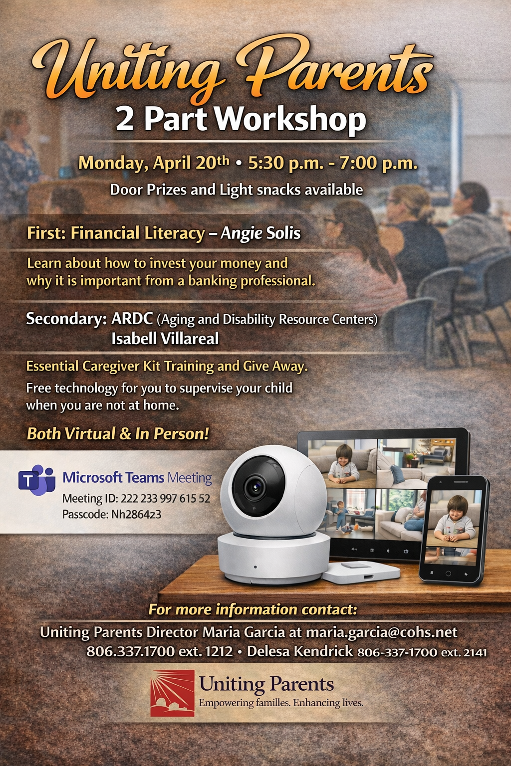 Uniting Parents is a parent case management program that supports families raising children with chronic illnesses or disabilities. The program serves families across the upper 32 counties of the Texas Panhandle and focuses on helping children from birth through age 21 receive the care, guidance, and resources they need to thrive. By connecting families with services and support, Uniting Parents helps parents feel more confident as they navigate complex health and education systems.